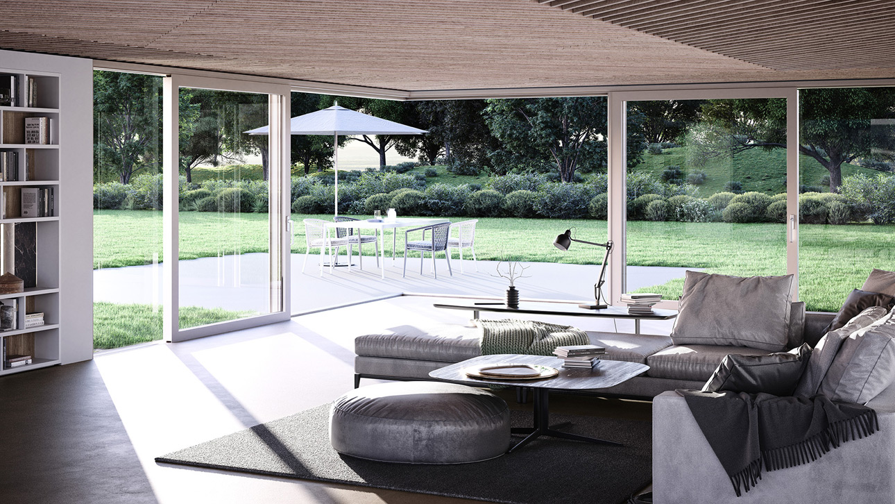 Als Ganzglas­ecke oder Flügel­ecke zum Öffnen entstehen licht­durchflutete Räume und ein völlig neues Raum­erlebnis.